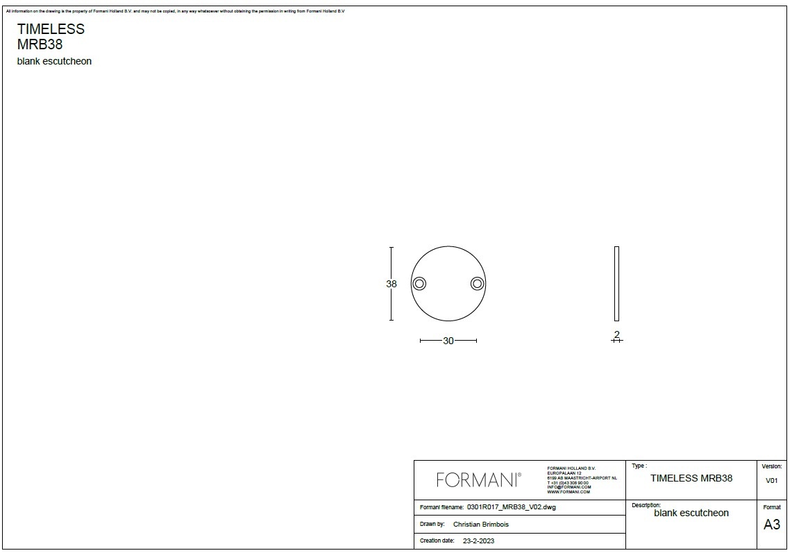 1 Blindplatte "TIMELESS" aus unlackiertem Messing Ø 38 mm und 2 mm dick, entworfen von Formani