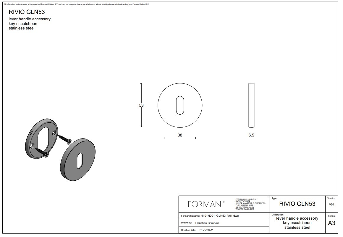 Das Schlüsselschild gehört zur „RIVIO“-Serie von Formani und ist aus Edelstahl gefertigt. Als letzte Behandlung wird dieses Bild gebürstet, wodurch es ein mattes Aussehen erhält.