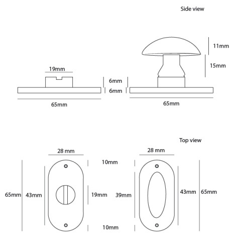 Die ovale Toilettengarnitur hat eine Gesamthöhe von 65 mm und ist 29 mm breit. Diese 6 mm dicke Platte ist bereits mit zwei Schraublöchern mit einem Achsabstand von 43 mm versehen.