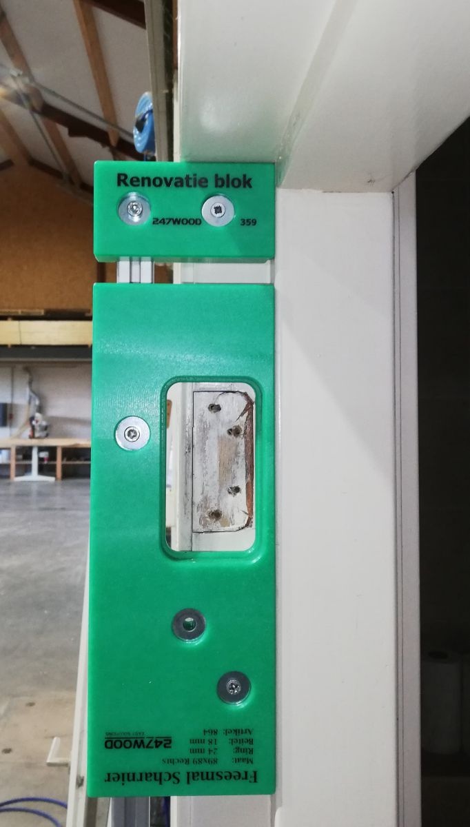 Mit einem Renovierungsblock an Ihrer Führungsschiene können Sie den Frässchablonensatz auch auf Ihre neue Tür übertragen, Sie haben die vorhandenen Aussparungen kopiert.