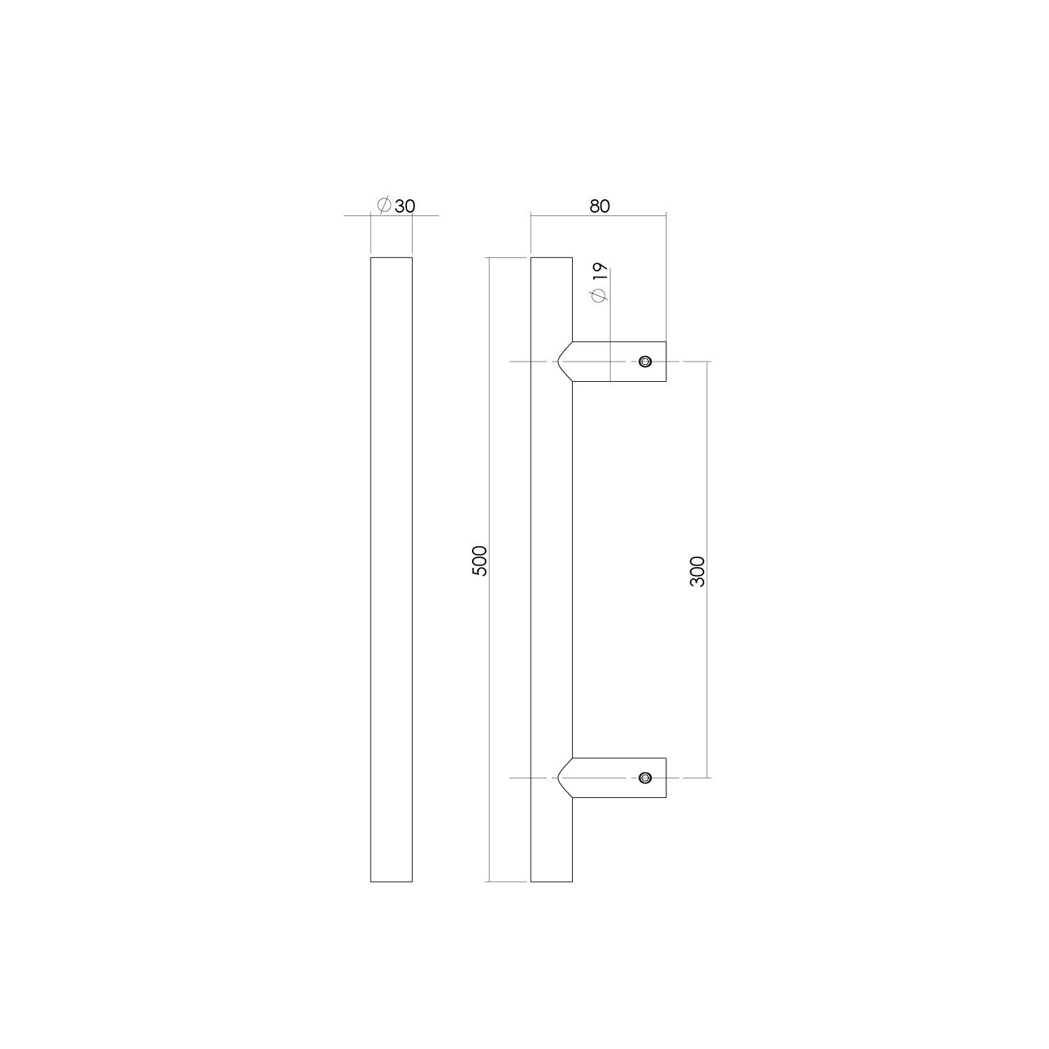 Die Edelstahl-Türgriffe sind 500 mm lang, haben eine Dicke von 30 mm und sind 80 mm vorgezogen. Der Achsabstand beträgt 300 mm. Die Stärke von 30 mm sorgt für eine schön verarbeitete Tür.