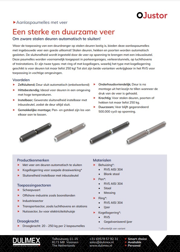 Wenn Sie Stahltüren haben, die Sie in feuchten Bereichen automatisch schließen möchten, können Sie sich für dieses Edelstahlscharnier mit Feder entscheiden. Dieses Scharnier hält garantiert mindestens 500.000 Bewegungen. Dadurch kann das Scharnier an vielen Orten eingesetzt werden, von einer Bohrinsel bis zum Boden oder Wasser, aber auch an Orten mit hohen Temperaturen. Es wird Edelstahl 304 verwendet, da dieser besser schweißbar ist. Der Stift ist aus AISI 316-Qualität.