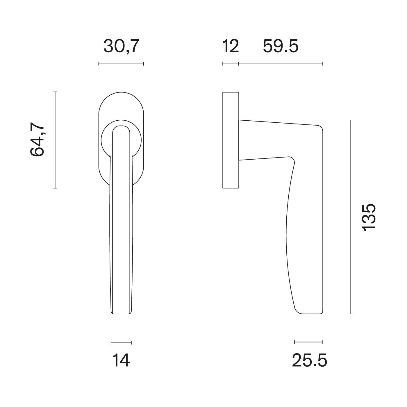 Der 25,5 x 14 mm große Griff ruht auf einer 64,7 x 30,7 mm großen ovalen Rosette.