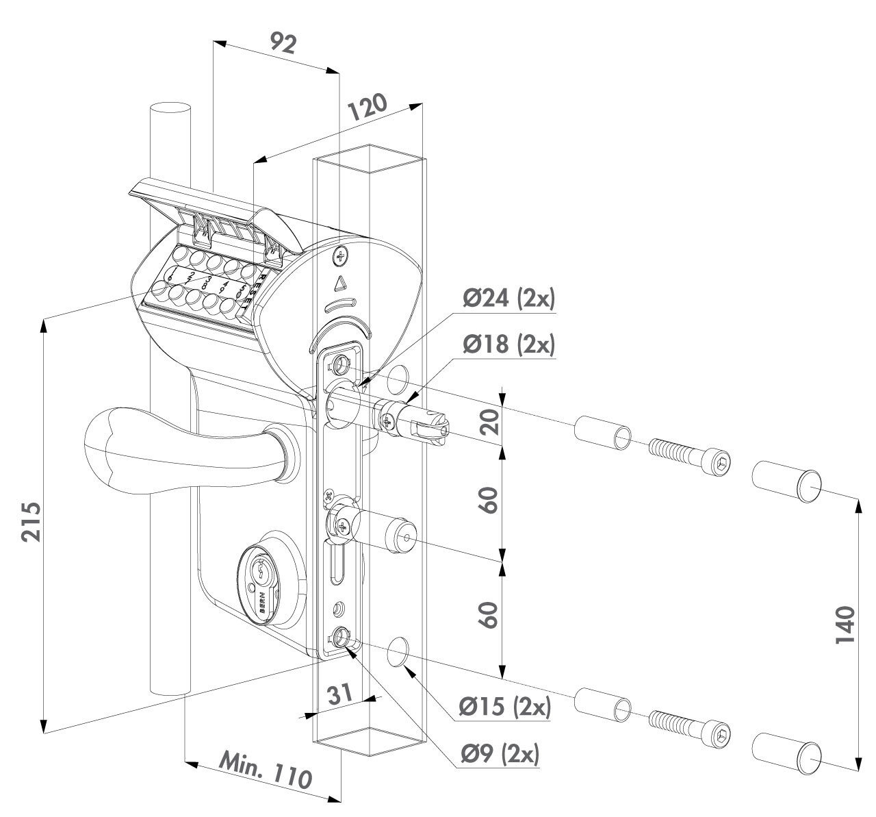 Für eine schnelle und äußerst präzise Montage empfehlen wir die Verwendung der Bohrlehre Drill-Fix. Das VINCI-Codeschloss wird mit Türgriff 3006C und Zylinder geliefert.