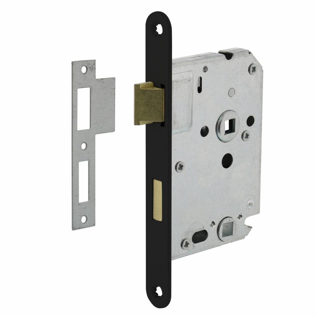 WC-Schloss für den Wohnungsbau, Schwarz lackiert mit einer Schaftgröße von 63 mm und einem Dorn von 50 mm inkl. Schlossplatte