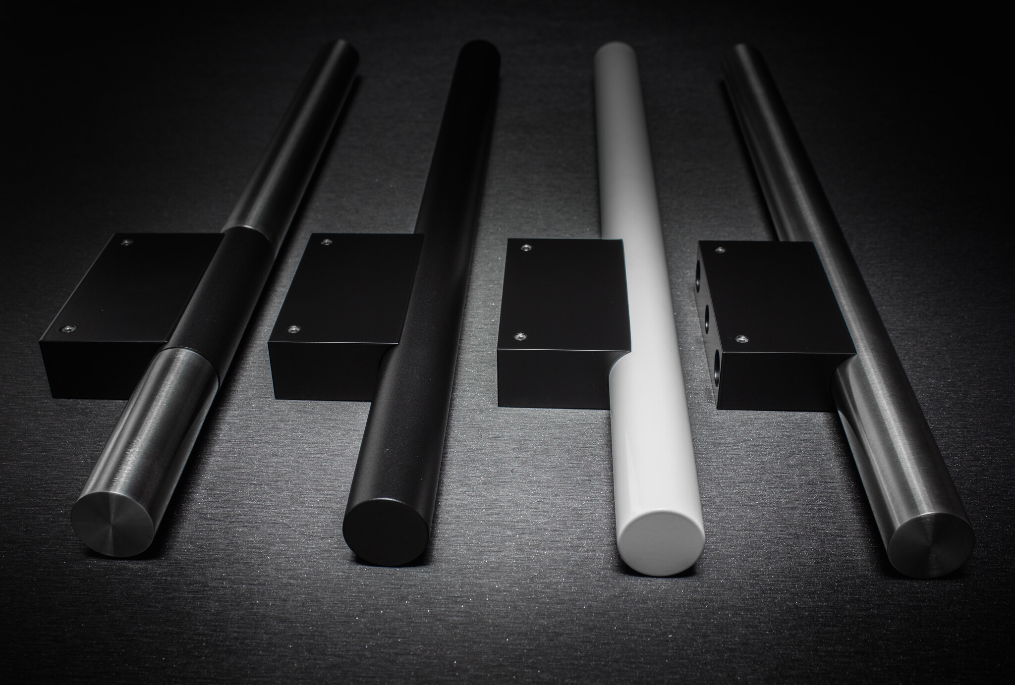 Dieser moderne Türgriff ist aus Edelstahl gefertigt. Die Basis selbst besteht aus Aluminium und verfügt über zwei Befestigungspunkte, die für zusätzliche Stabilität sorgen (der Abstand zwischen den beiden Befestigungspunkten beträgt 80 mm). Sowohl der Türgriff als auch die Füße sind mit einem eloxierten schwarzen Strukturlack versehen.