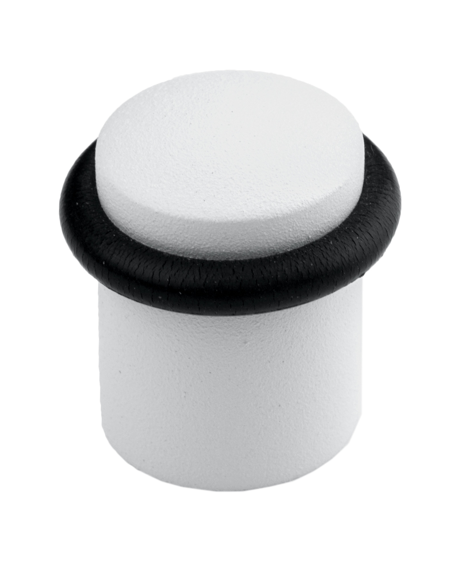 Bodentürstopper aus massivem weißem Edelstahl mit mattweißer Oberfläche. Der Türstopper mit einem Durchmesser von 32 mm und einer Höhe von 35 mm schützt sowohl die Tür als auch die Wand vor Beschädigungen.