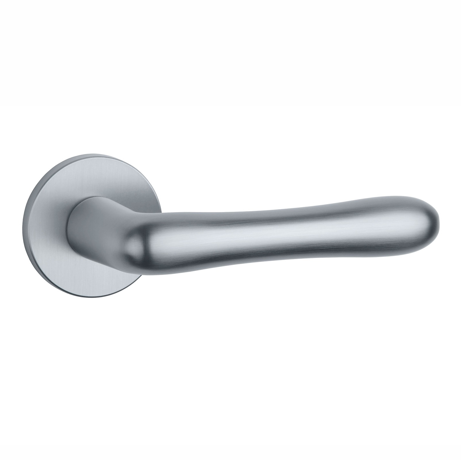 Beschreibung Mattchrom Aprile Türgriffe CYNIA auf runden gefederten Rosetten Ø 53x7mm