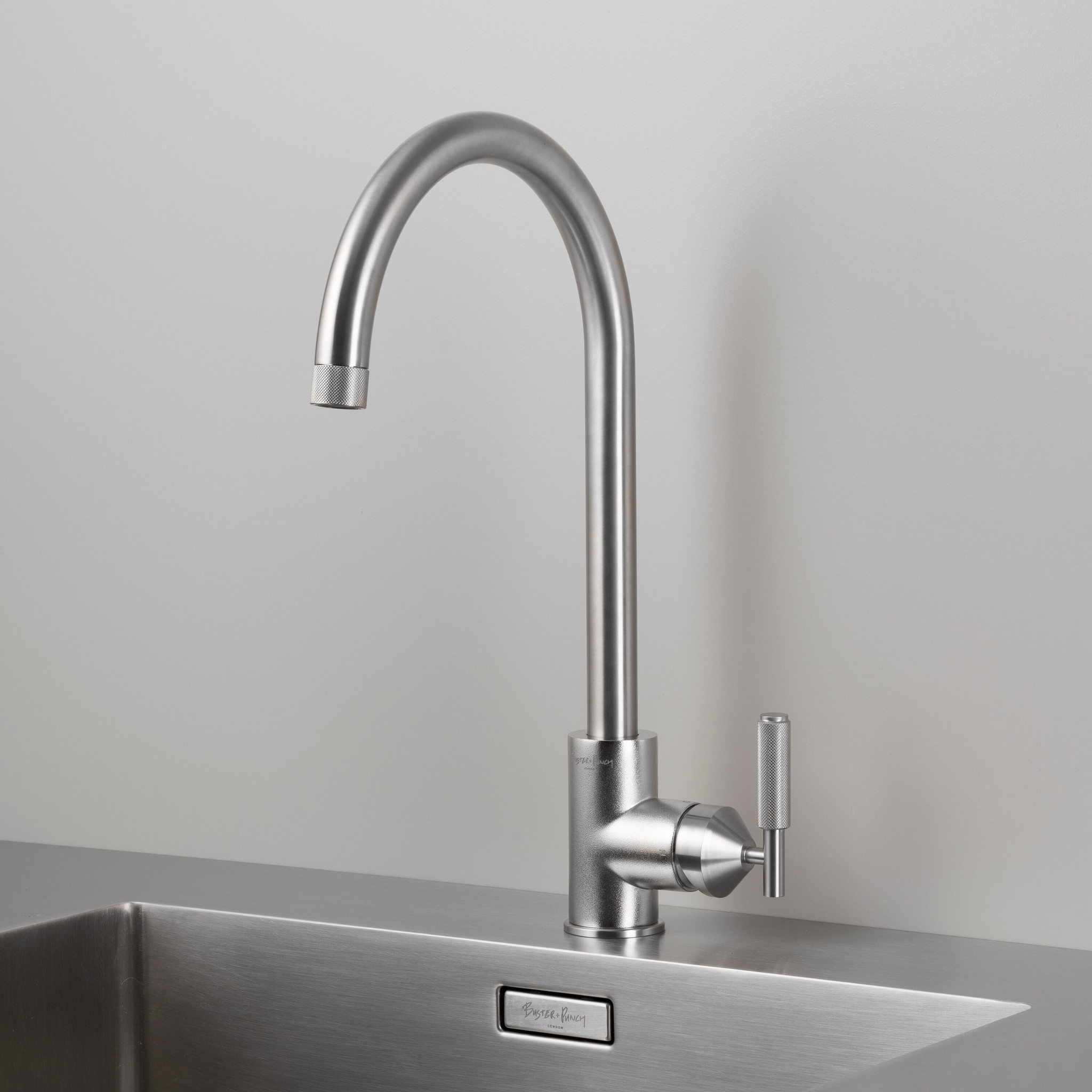 Bei diesem Artikel handelt es sich um eine Küchenarmatur mit Einhebelmischer, die Filterkappe und der Griff Cross Cut sind aus Edelstahl. Diese Armatur wird in Italien aus massivem Edelstahl gegossen, sandgestrahlt und gefräst. Das charakteristische kreuz und quer gezackte Muster wird dann von Hand veredelt.
