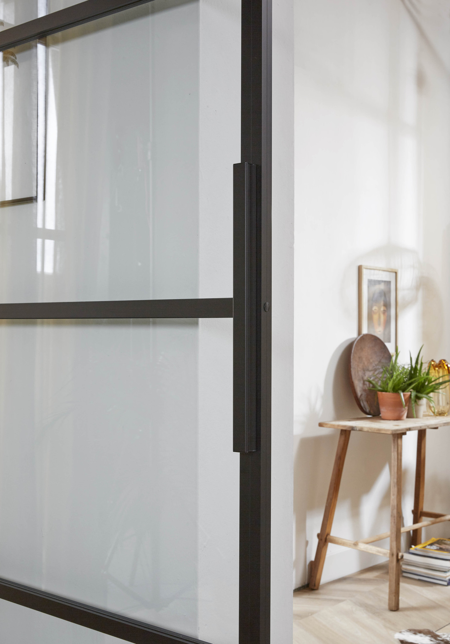 Die Tür besteht aus einem schwarzen Aluminiumprofil und vier Glasscheiben, die Sie einfach montieren können. Die Schiebetür ist 215 cm hoch, 98 cm breit und hat eine Dicke von 2,8 cm. Das transparente gehärtete Glas ist 6 mm dick.