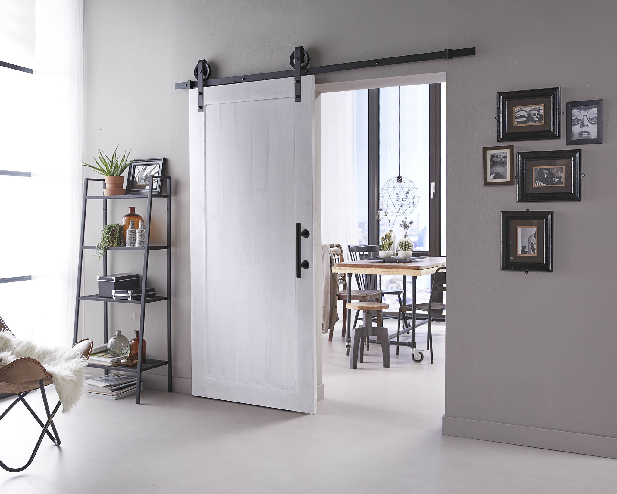 Diese massive Schiebetür wird mit einem schwarzen Schiebesystemrad (2 m) und einem schwarzen Griff mit Schiebetürschale geliefert. Dieser mattschwarze gerade Türgriff hat eine Länge von 305 mm und einen Durchmesser von 25 mm. Auf der anderen Seite finden Sie eine flache Schiebetürschale von 220x60mm, die durch und durch angebracht ist.