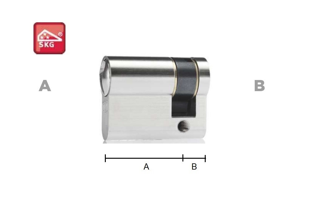 Die Zylinder sind in verschiedenen Längen erhältlich. Der Zylinder startet serienmäßig bei 30/10 mm und kann außerdem außen um 5 mm verlängert werden (A).
