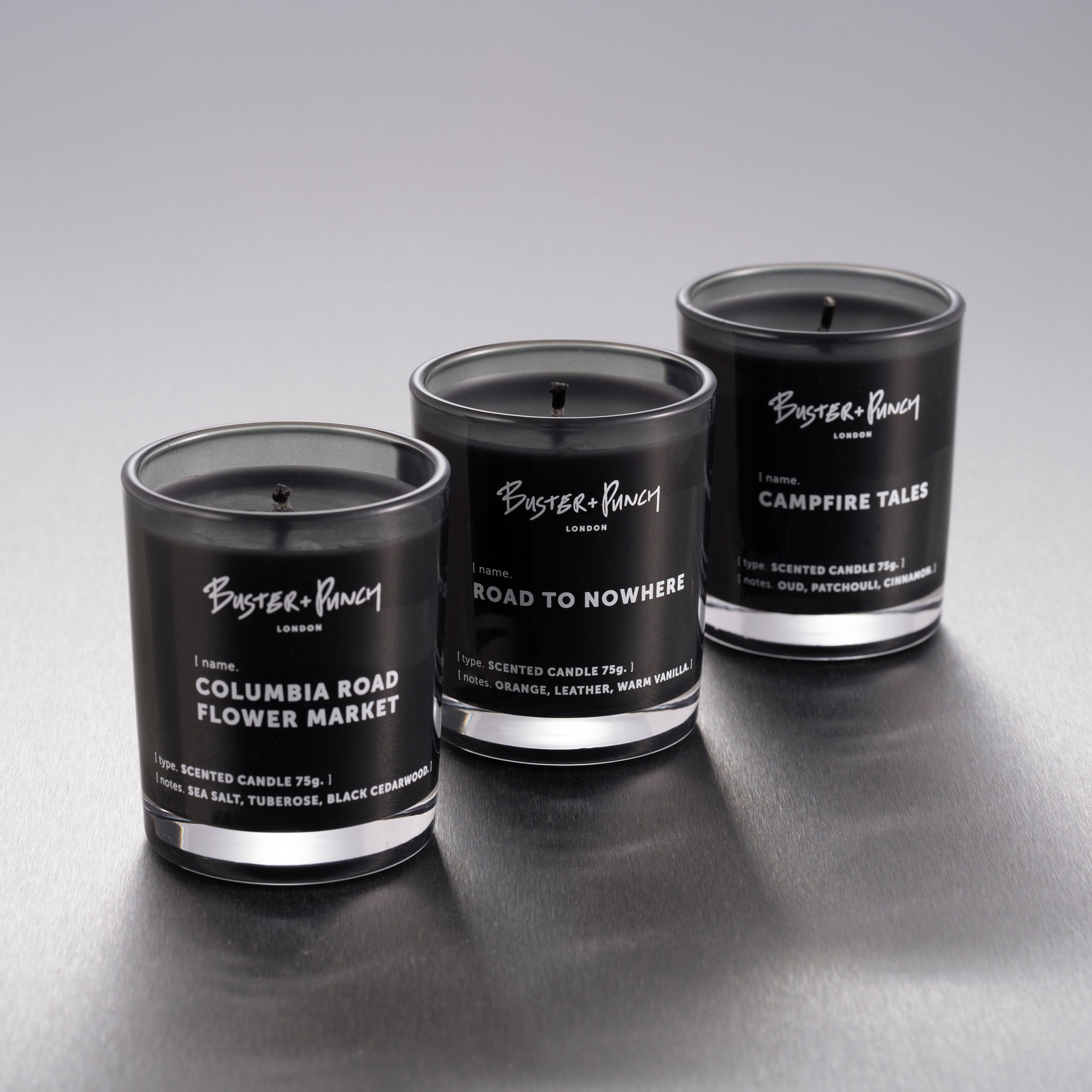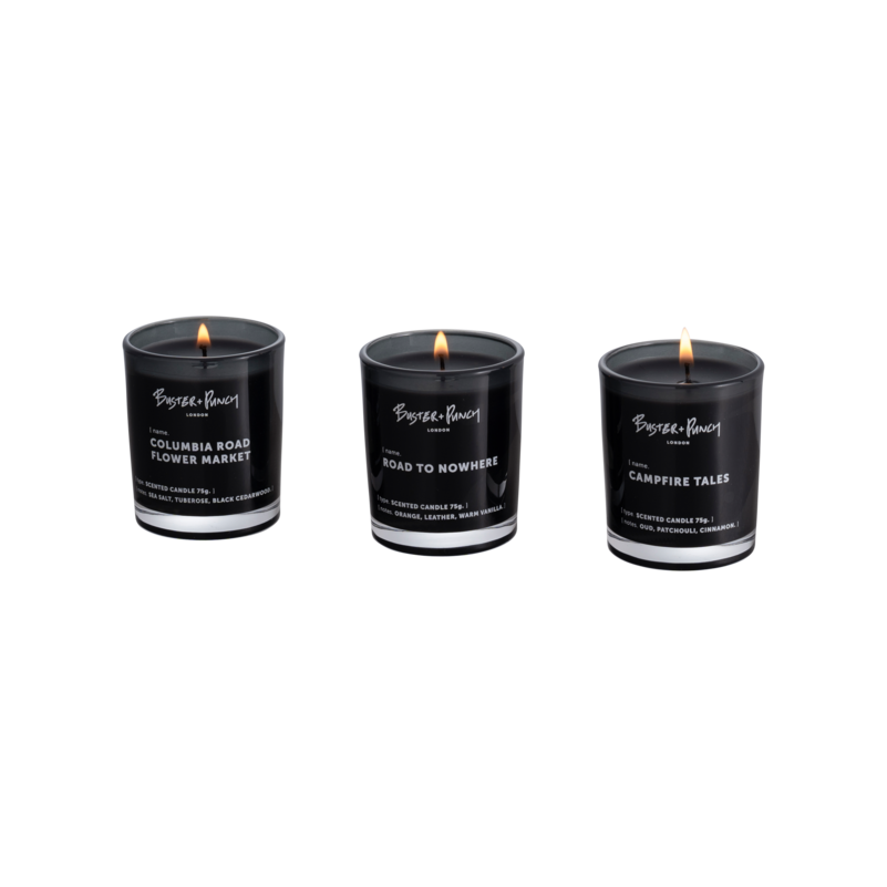 Eine Sammlung von drei 75-g-Luxus-Duftkerzen aus schwarzem Paraffinwachs mit 3 verschiedenen handgefertigten Düften. Enthält die Kerzen „Road to Nowhere“, „Columbia Road Flower Market“ und „Campfire Tales“. Jede Duftkerze wird in einem rauchgrauen Glas mit weißer Beschriftung geliefert. Verpackt als perfektes Geschenk.