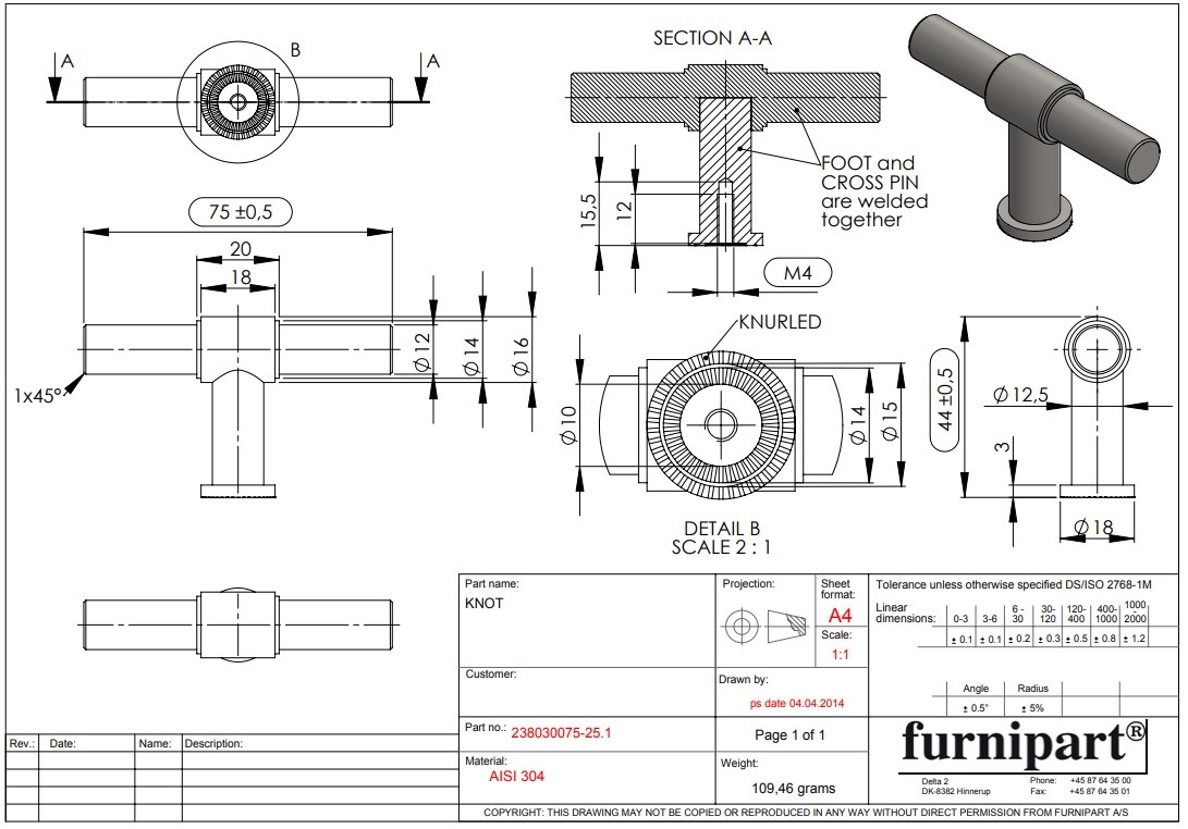 Edelstahl-möbelgriff T-Modell von Furnipart mit einem Griff von 75 mm Breite - KNOTEN