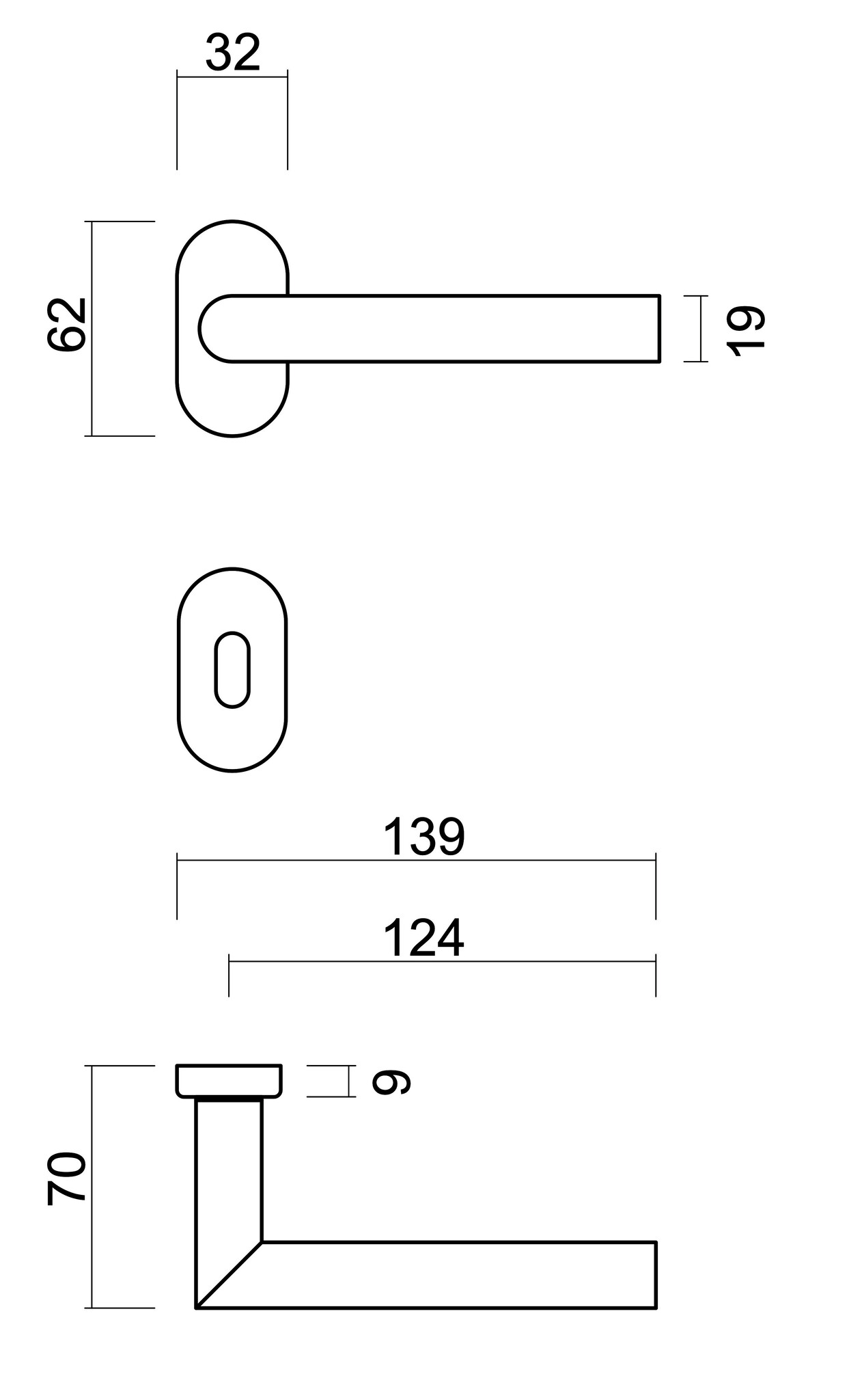 Der Griff ist rechtwinklig und hat eine Dicke von 19 mm.