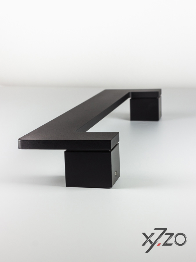 Der massive Türgriff aus Edelstahl ist elektrolytisch schwarz lackiert und weist eine feine Struktur auf. Die Aluminiumfüße sind zudem mit einer eloxierten schwarzen Lackierung versehen, die dafür sorgt, dass die Türgriffe für den Innen- und Außenbereich geeignet sind.