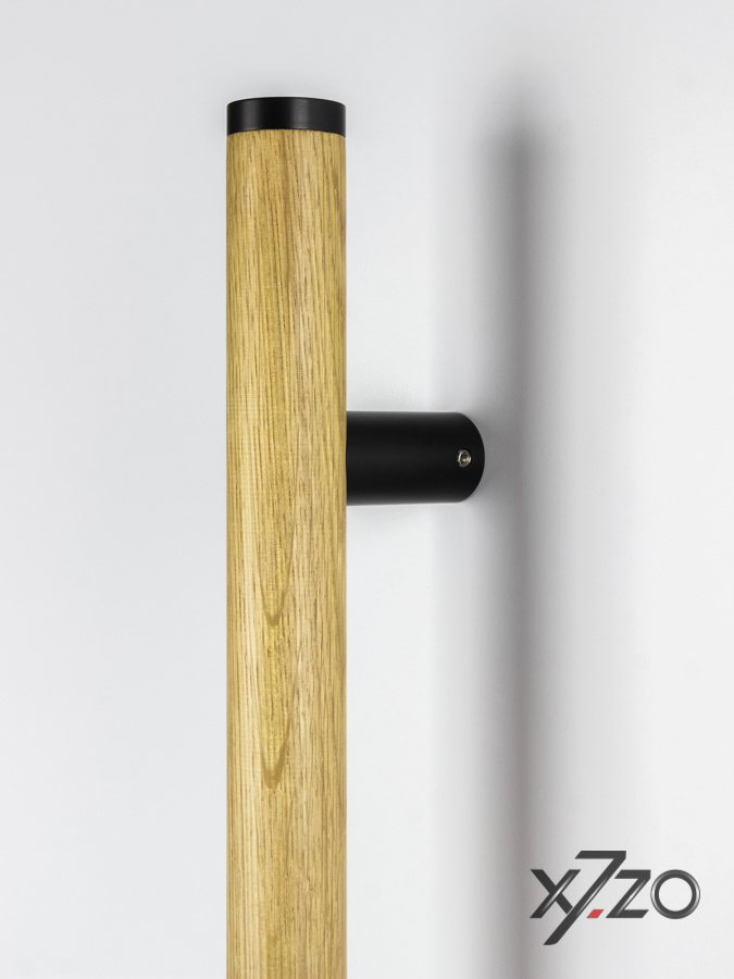 Der Türgriff aus Eichenholz ist bis zu 3-fach mit einem Schutzöl versehen, das eine lange Lebensdauer des Holzes gewährleistet. Die Halterungen und die Endbearbeitung des Türgriffs bestehen aus Aluminium, das mit einer eloxierten schwarzen Beschichtung versehen ist.