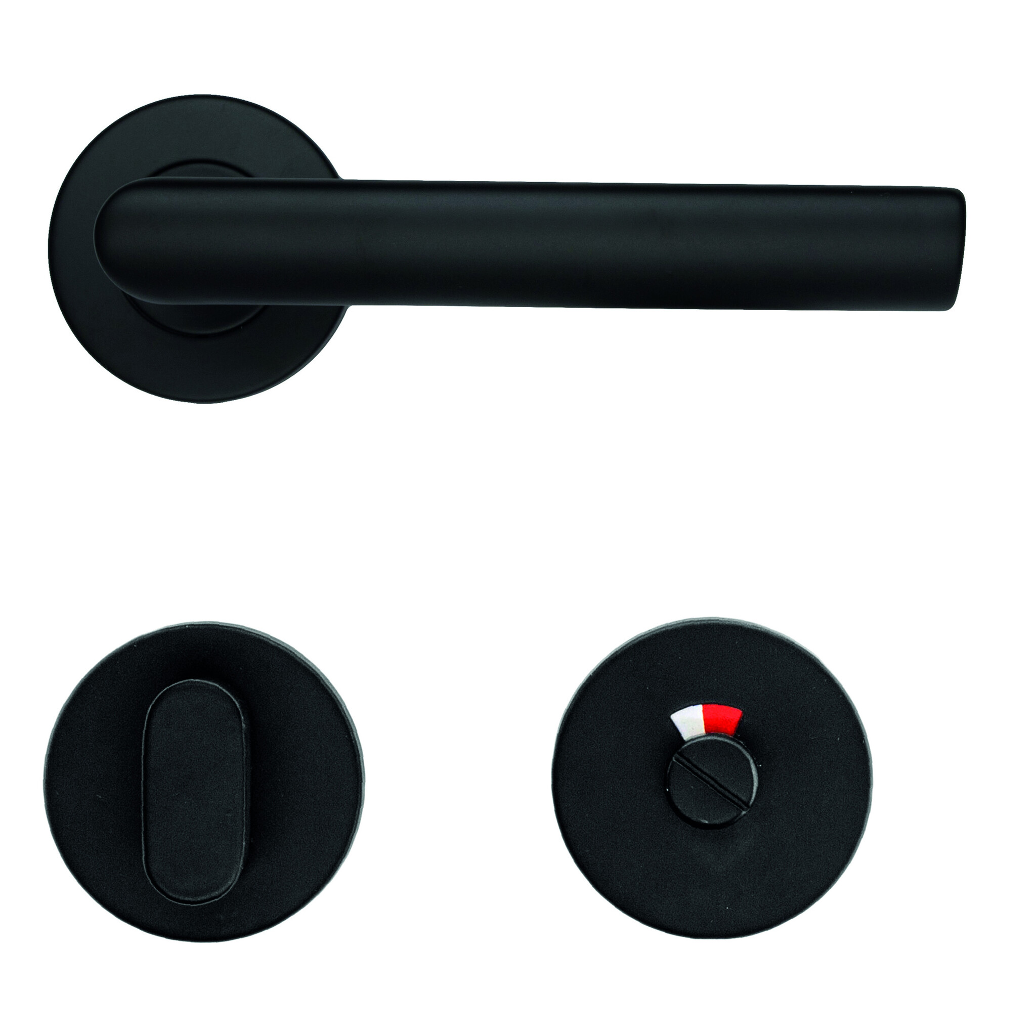 Die schwarzen ovalen Türgriffe stehen auf runden Rosetten und sind in 4 Varianten erhältlich: ohne Schlüsselschild, mit Schlüsselschild, mit Zylinderschild und mit WC-Garnitur. Treffen Sie Ihre Wahl im Scrollmenü oben rechts.