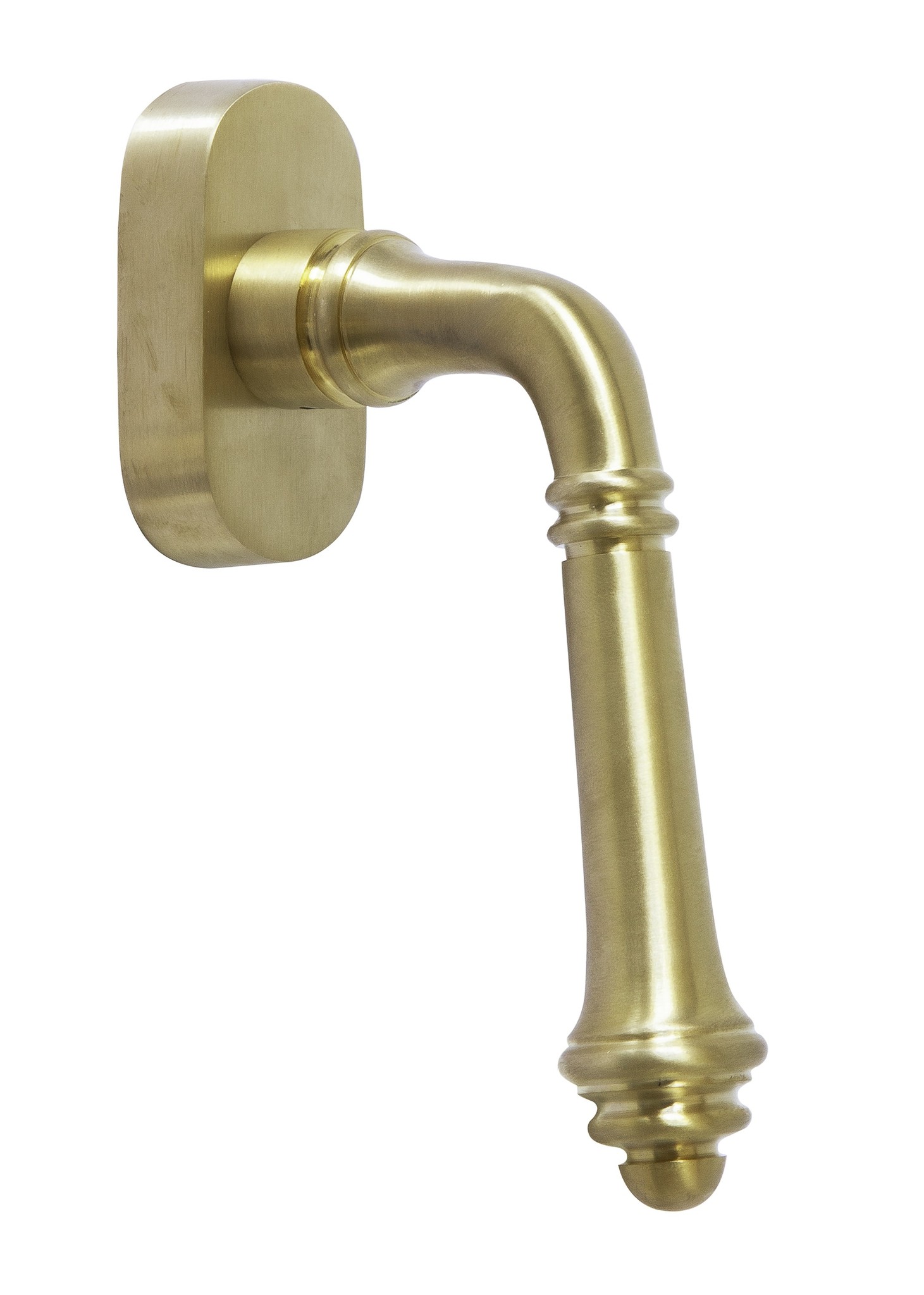Der Fenstergriff aus der Kollektion CDL (Créations de Laiton) steht auf einer ovalen Rosette mit einer Höhe von 68 mm und einem Überstand von 15 mm.