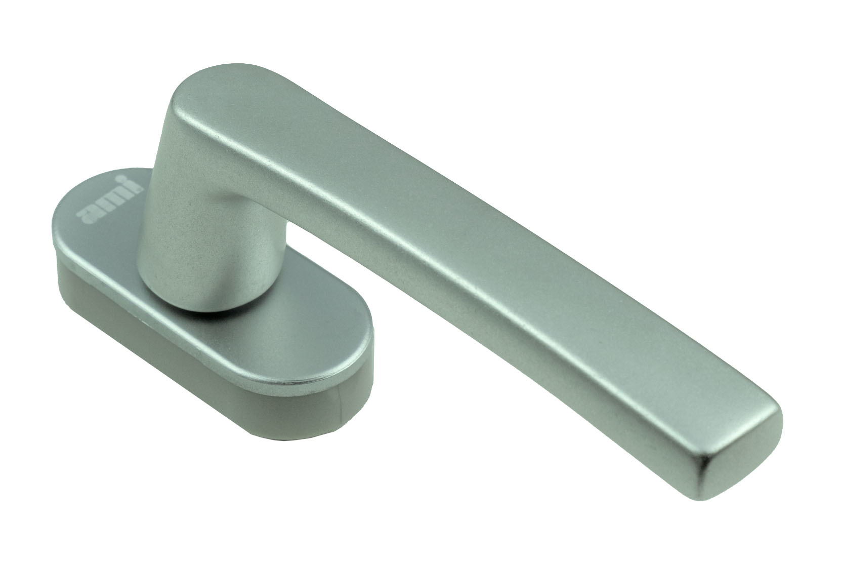 Fenstergriff auf einer ovalen Rosette aus Aluminium mit starkem F1-Aluminium-Finish.