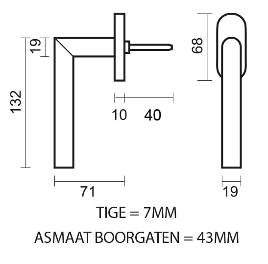 Der Griff ist auf einer 68 mm langen Rosette montiert und wird inklusive Montagematerial und einer Vierkantspindel (7 x 7 x 40 mm) geliefert. Die Befestigungslöcher haben einen Abstand von 43 mm, was eine einfache und korrekte Montage gewährleistet.