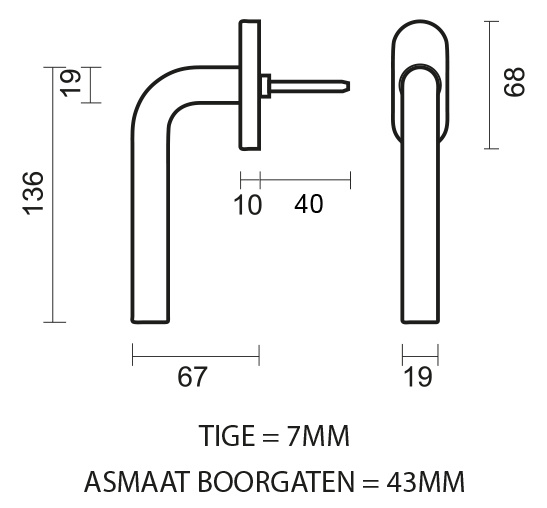 Der Griff steht auf einer ovalen Rosette mit einer Länge von 68mm. Die Befestigungslöcher haben einen Abstand von 43 mm.