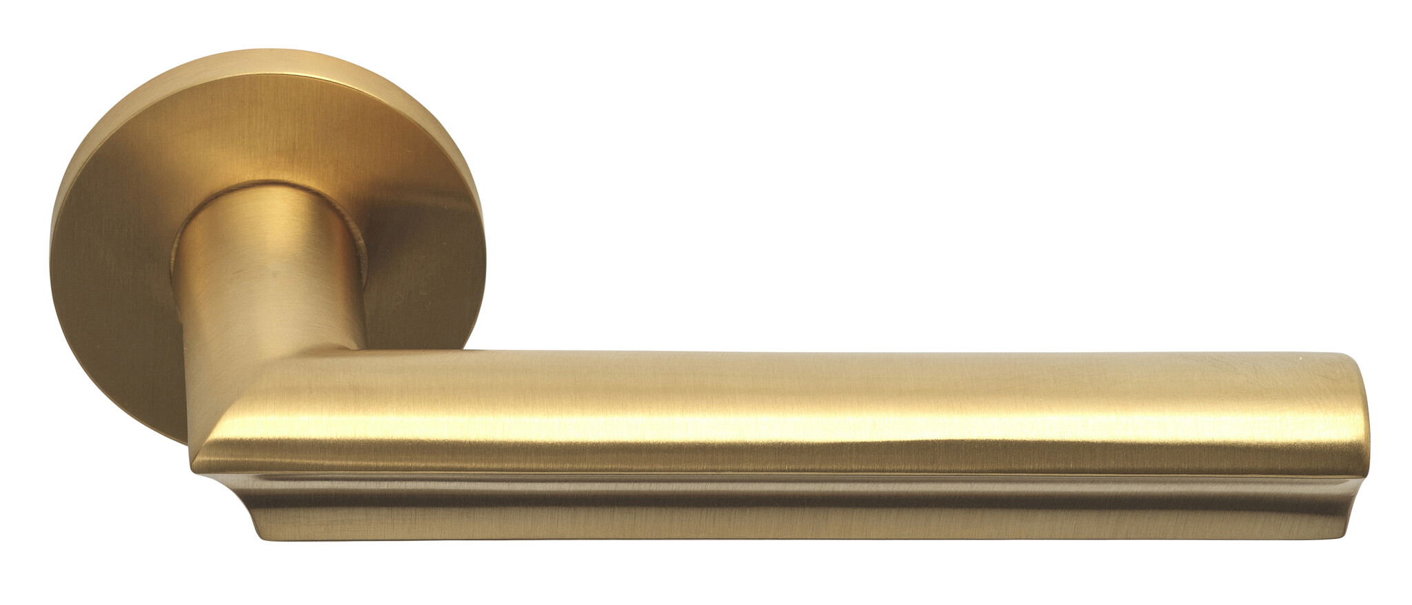 Beschreibung Massive gefederte Türgriffe ECLIPSE auf runder Rosette in Mattgold von Formani mit engem rechten Winkel