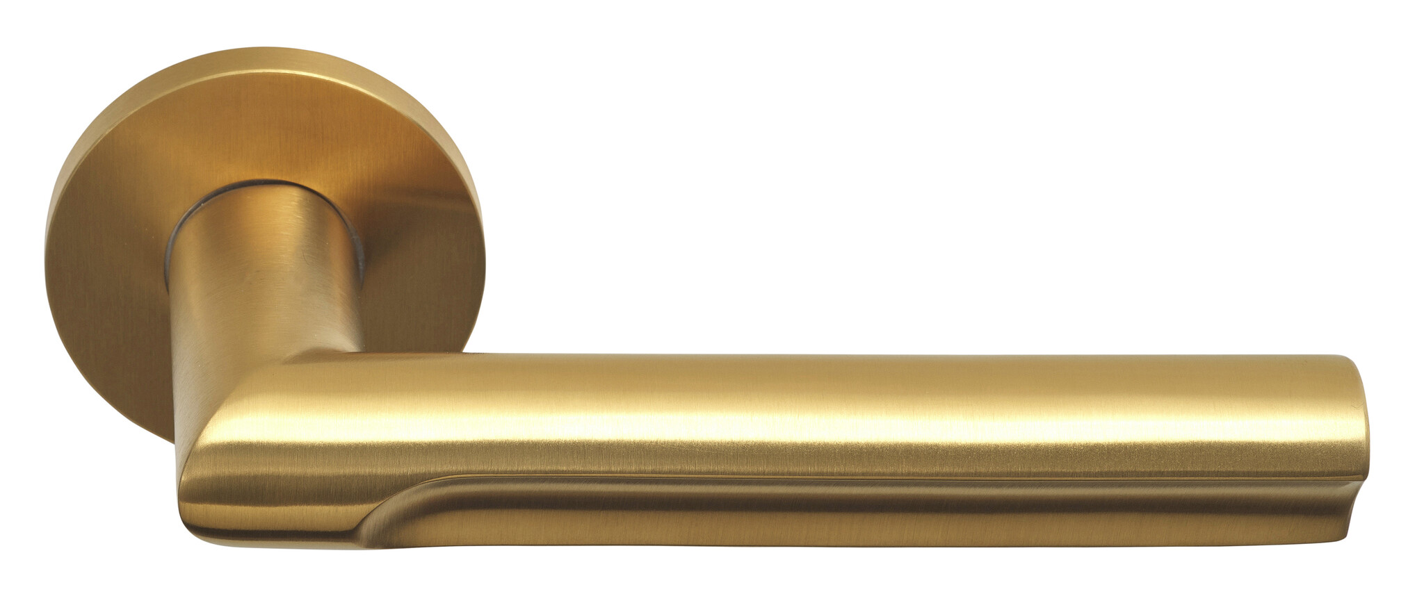 Diese mattgoldenen Türgriffe, die mit gefederten Rundrosetten mit einem Durchmesser von 53 mm und einer Stärke von 6,5 mm ausgestattet sind, sind am Ende mit einer kräftigen mattgoldenen PVD-Beschichtung versehen.
