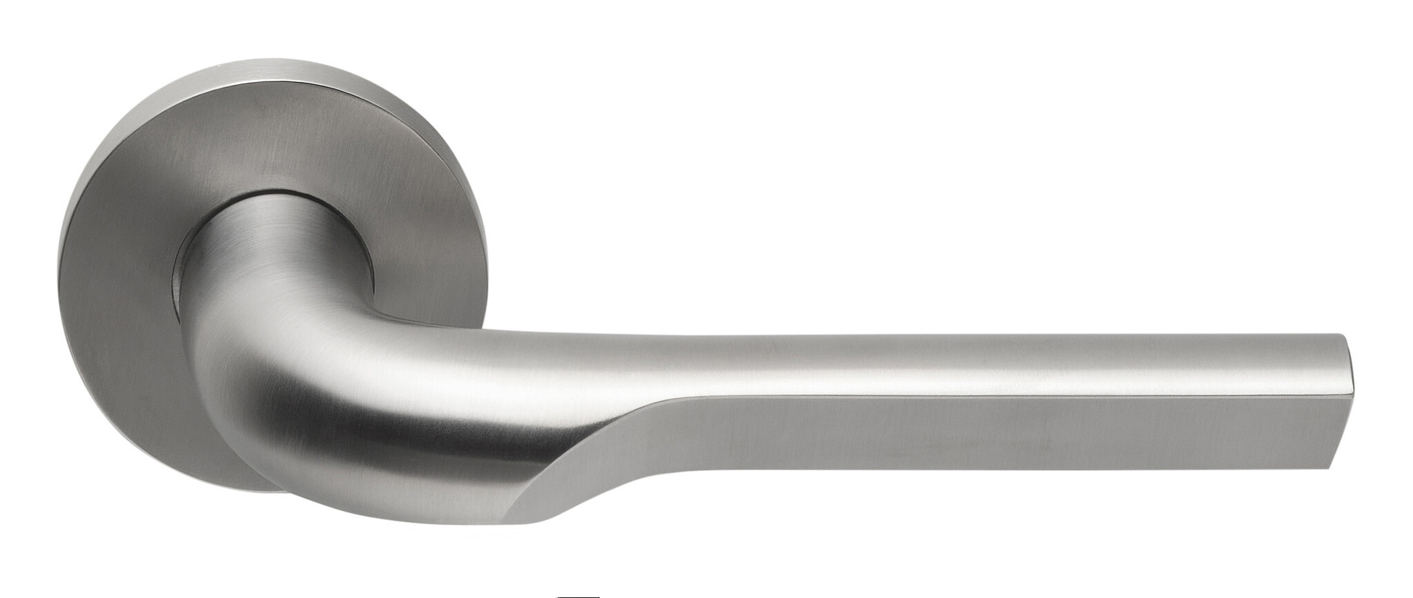 Die Design-Türgriffe sind in zwei Varianten erhältlich, mit geschwungenem Übergang und mit einem Winkel von 90° zum Hals und zur Rosette hin.