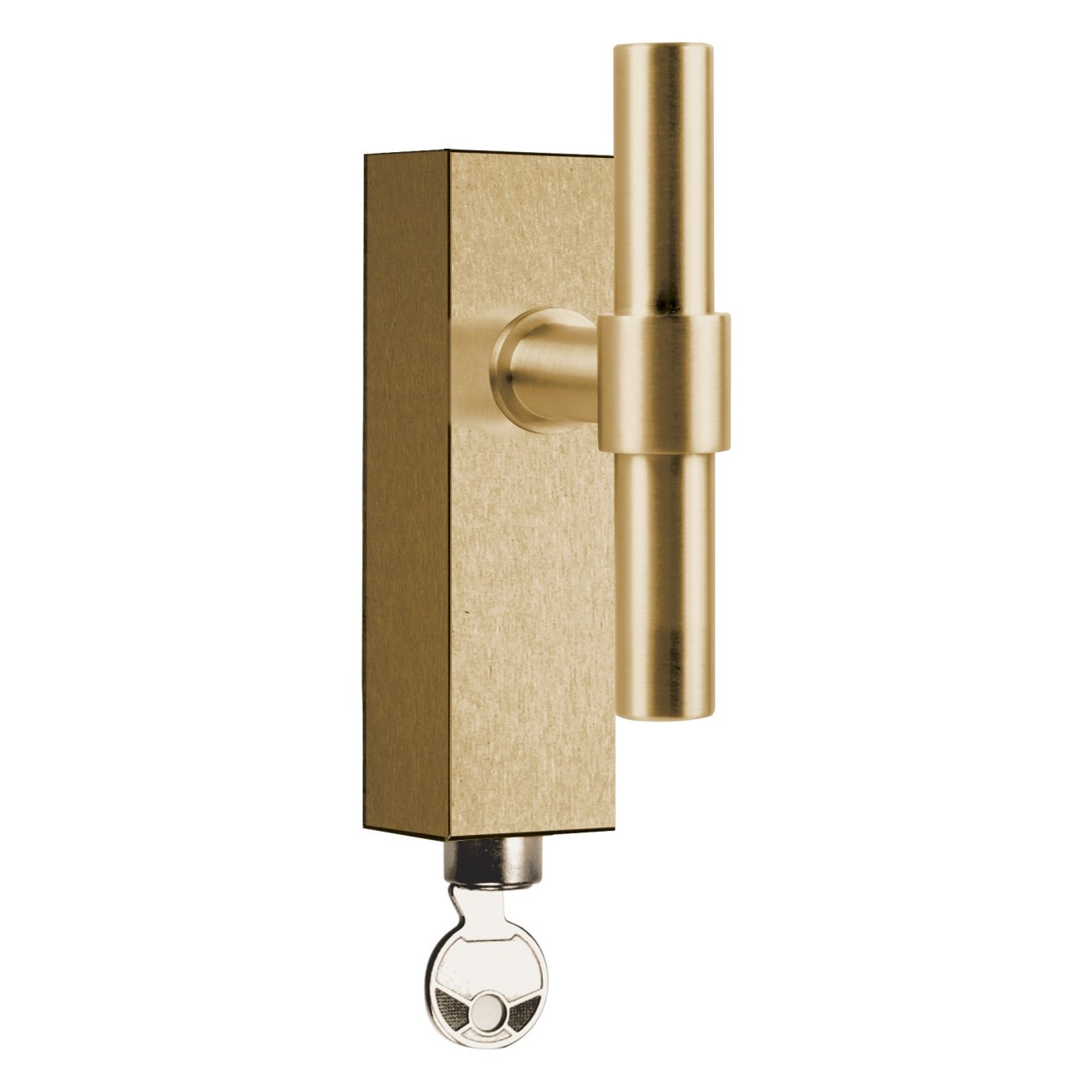 Der Fenstergriff in mattgoldener PVD-Beschichtung wird pro Stück inklusive Montagematerial, Schlüssel und einem 7x7 mm Stift geliefert. Bei Bedarf kann der Stift um 45 mm in der Länge gekürzt werden.