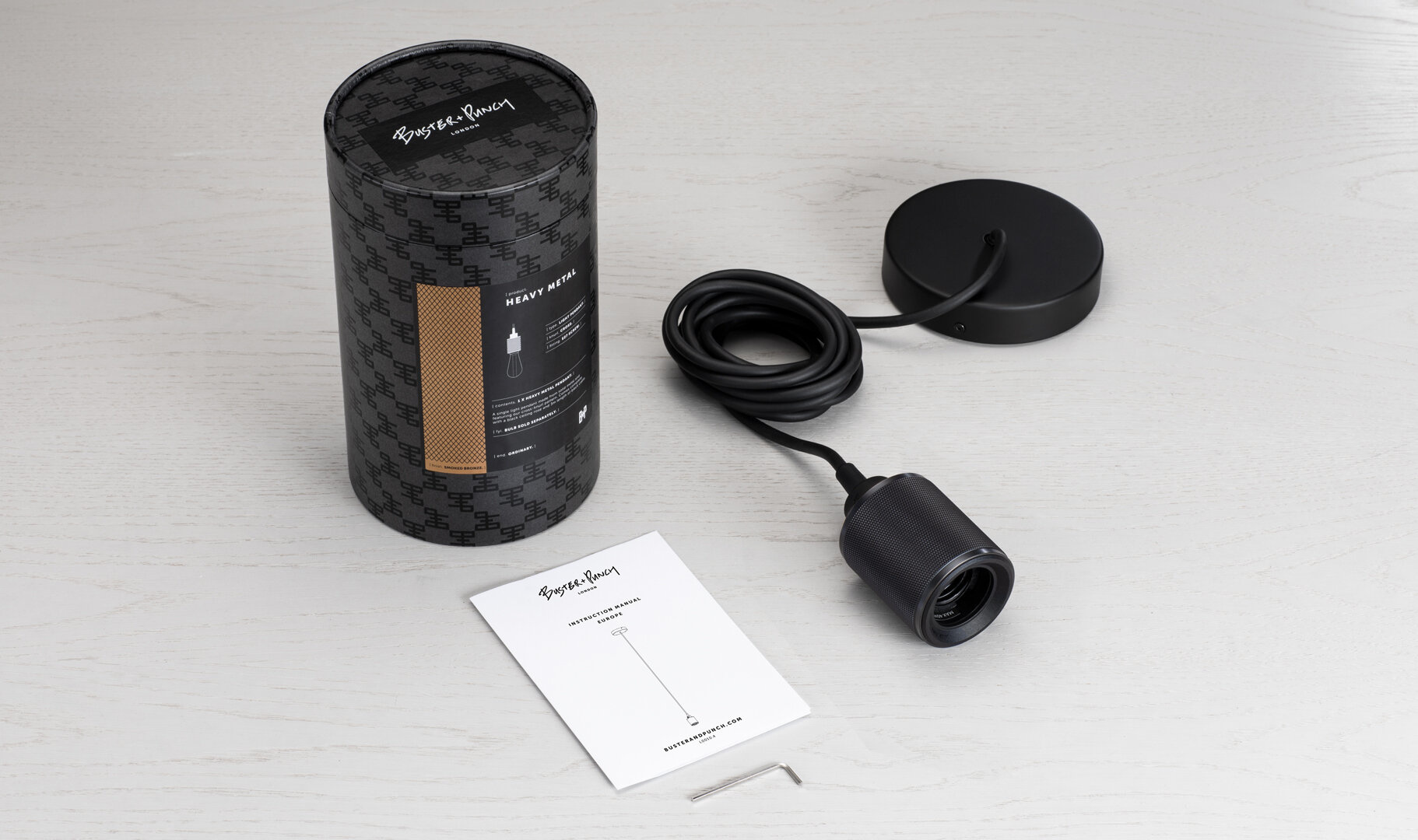 Diese Lampe aus Rauchbronze hat eine E27-Fassung und wird mit einem mattschwarzen Gummikabel von 3 m und einer mattschwarzen Deckenkappe geliefert. Am besten kommt das Licht in Kombination mit einer unserer LED BUSTER LAMPS zur Geltung.