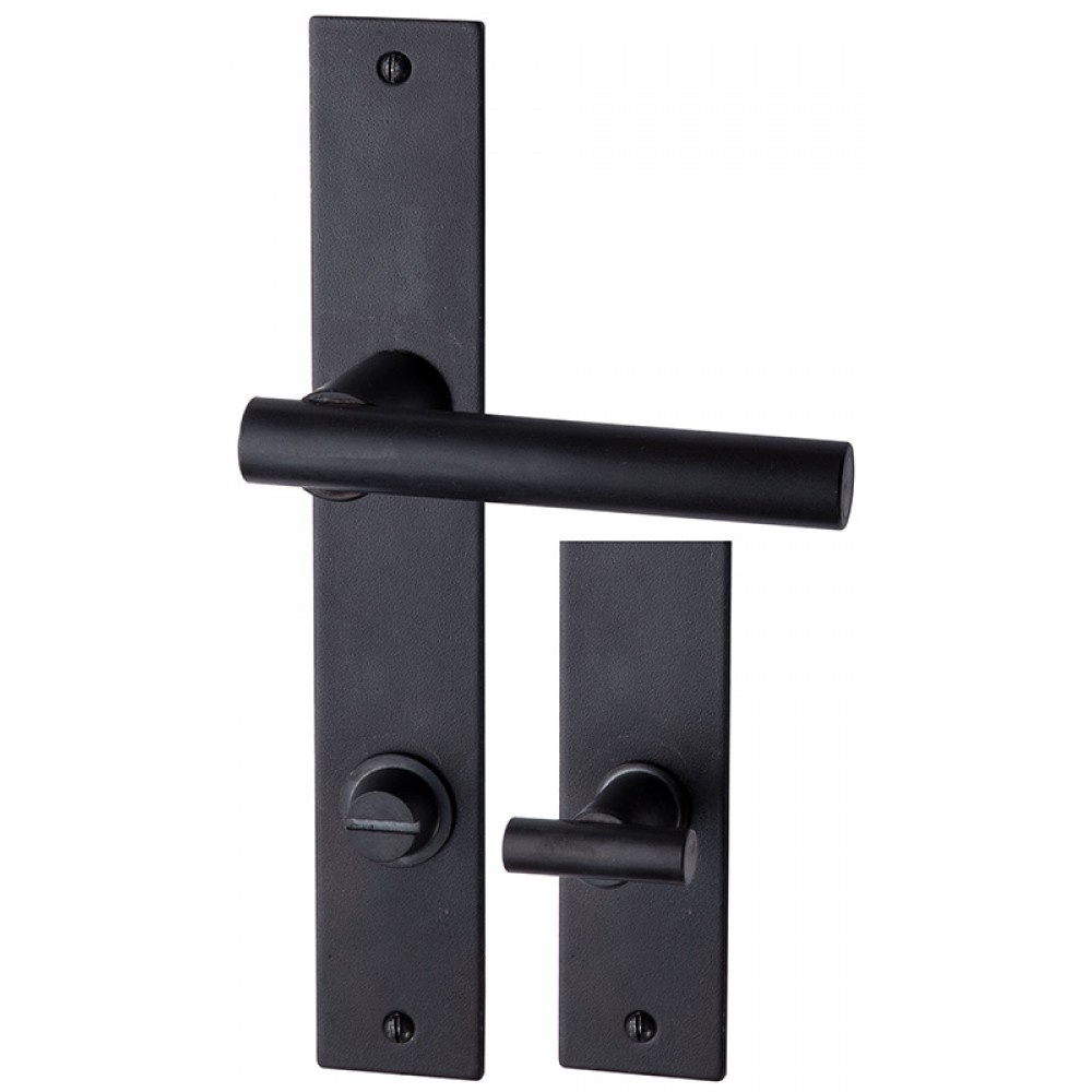 Beschreibung Türgriffe aus der stilvollen Serie „FÜGEN“ von Halcö, aus schwarzem, massivem, gehärtetem Stahl, mit sichtbaren Schrauben auf einem rechteckigen Schild montiert.