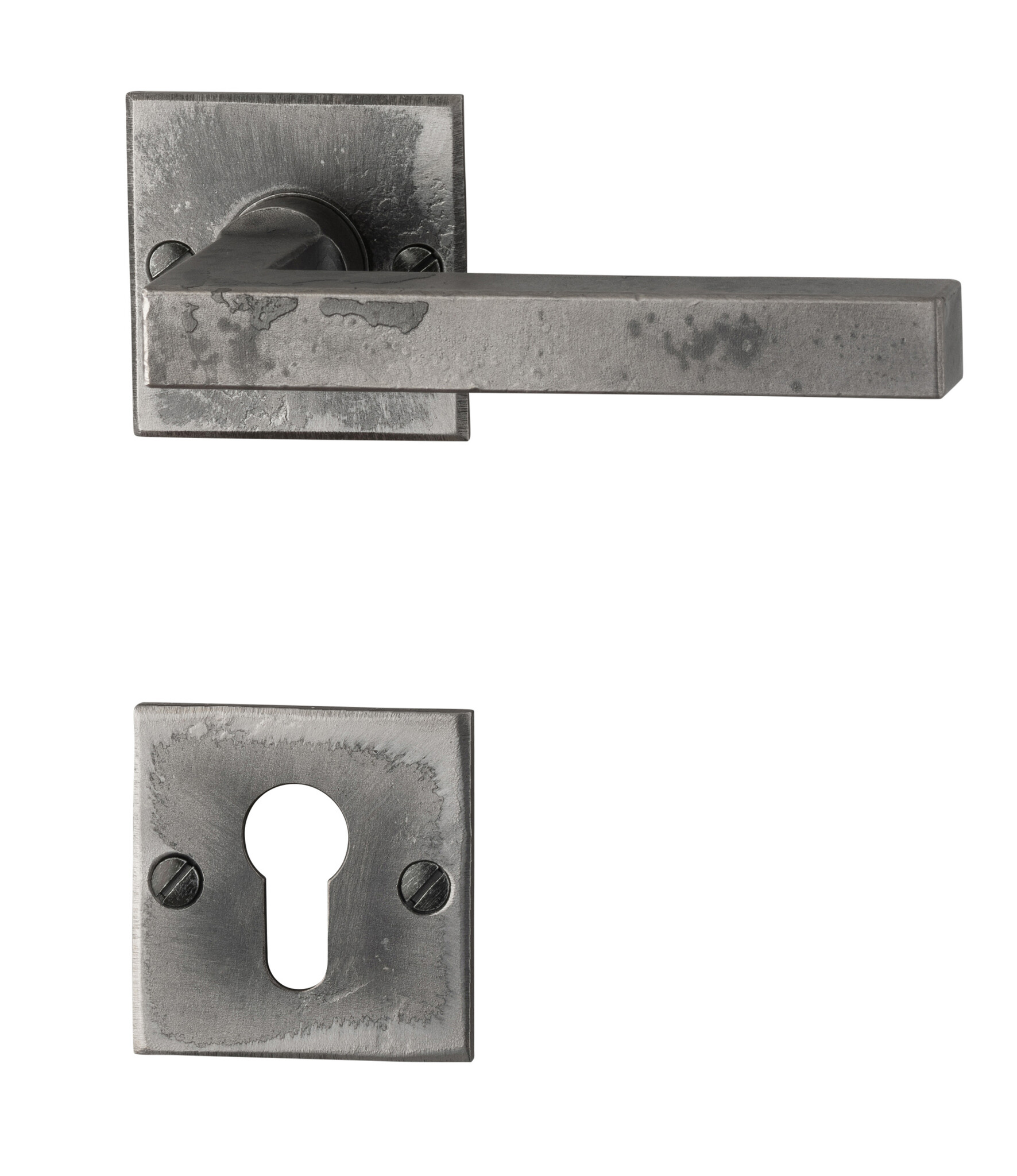 Edle Türdrücker auf einer schlichten, quadratischen Rosette aus Rohstahl.