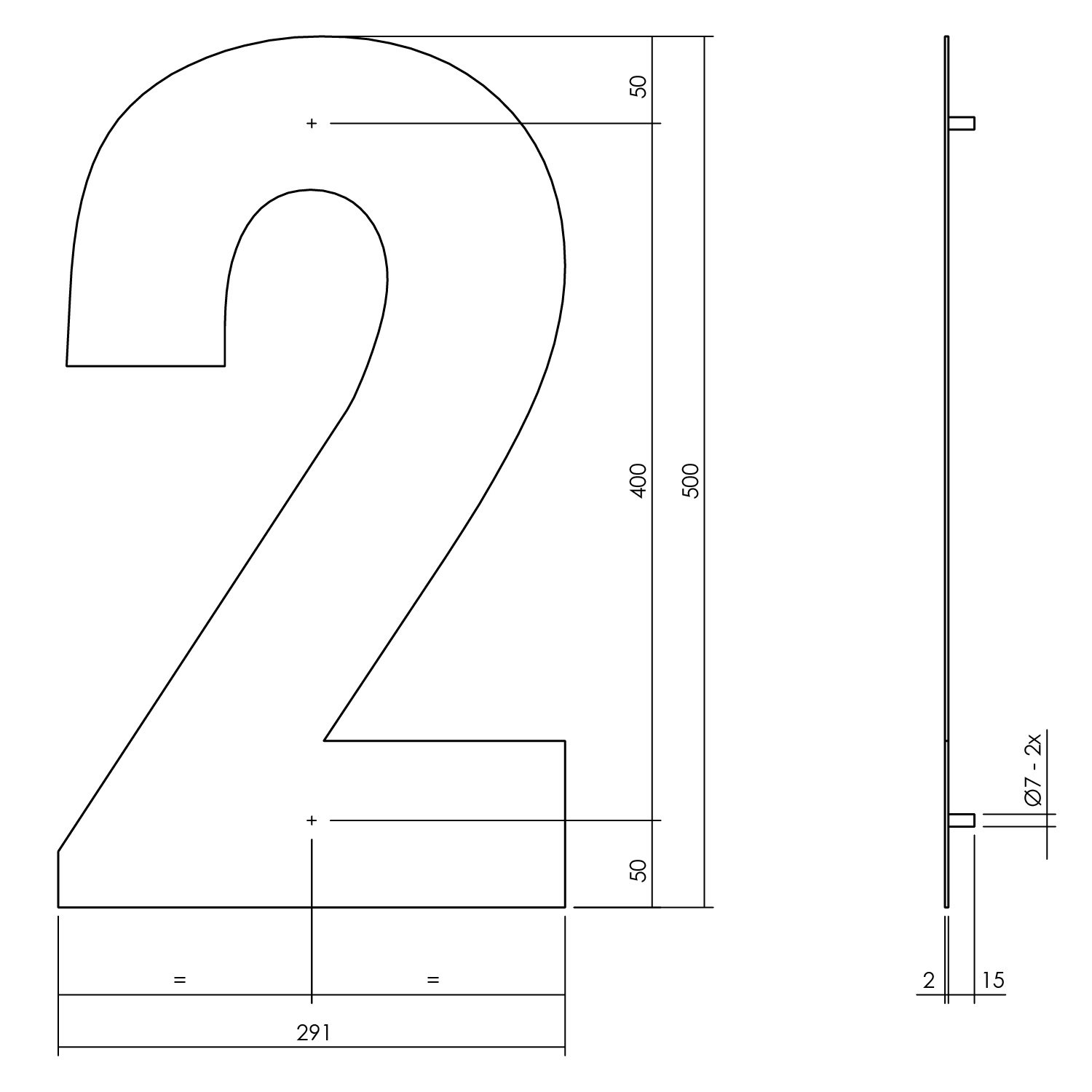 Diese XXL Hausnummer "2" ist aus Edelstahl gefertigt und in der trendigen Farbe mattschwarz veredelt. Es hat eine Höhe von 500 mm und eine Dicke von 2 mm. Die Hausnummer ist im montierten Zustand 15 mm von der Wand entfernt.