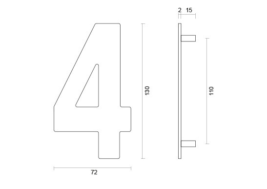Die Hausnummer hat eine flache Form mit einer Höhe von 130 mm und einer Dicke von 2 mm.