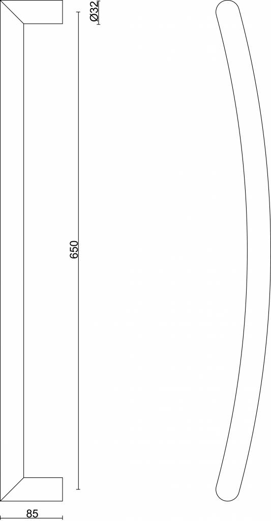 Dieser einzelne Türgriff aus Edelstahl hat eine Dicke von 32 mm und eine Achsgröße von 650 mm. In seiner Gesamtheit steht dieser Türgriff 85 mm vor.