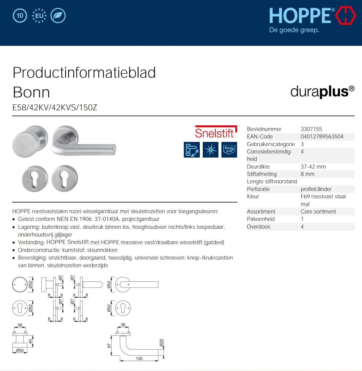 Diese Hoppe-Türgriffe sind für eine Türstärke von 57–62 mm geeignet und wurden gemäß NEN EN 1906: 37-0140A getestet. Der Schnellstift hat einen Durchmesser von 8x8mm und ist bereits in einem Lochteil befestigt.