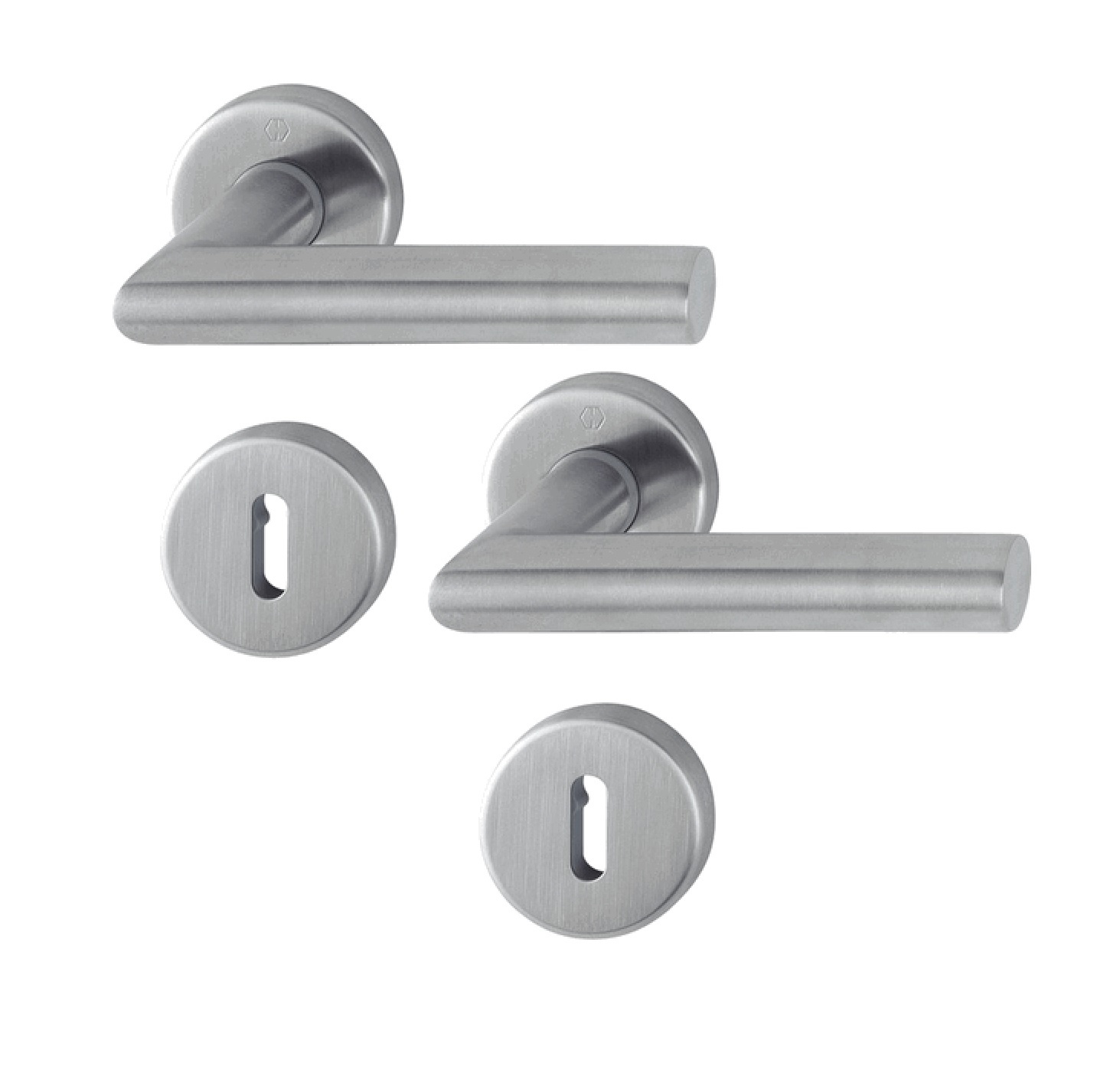 Diese Türgriffe aus Edelstahl von Hoppe sind mit einem Schnellstift ausgestattet.