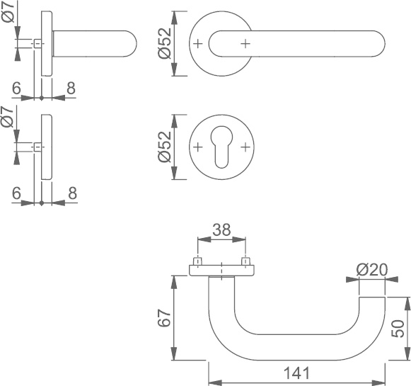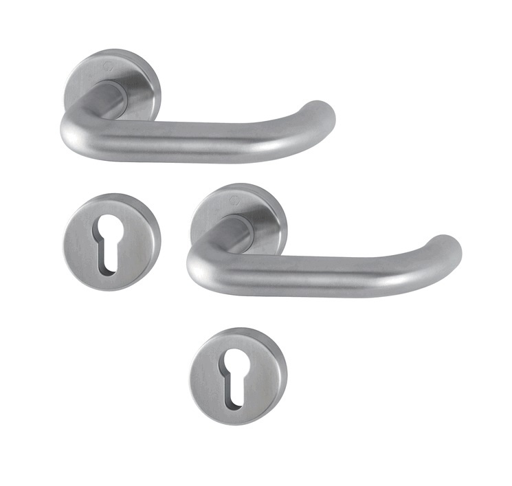 Diese Türgriffe aus Edelstahl sind doppelt gefedert und werden als Paar inklusive zugehöriger Zylinderplatten und Montagematerial, Gebrauchsanweisung und Bohrschablone geliefert.
