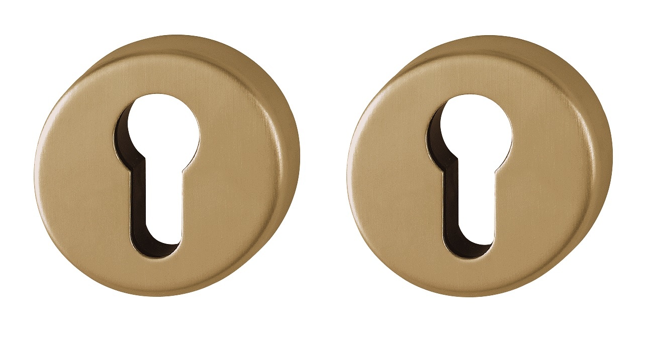 Diese Messingzylinderplatten gehören zu den Los Angeles-Türgriffen von Hoppe in Resista-Ausführung und haben eine Zylinderlochöffnung.