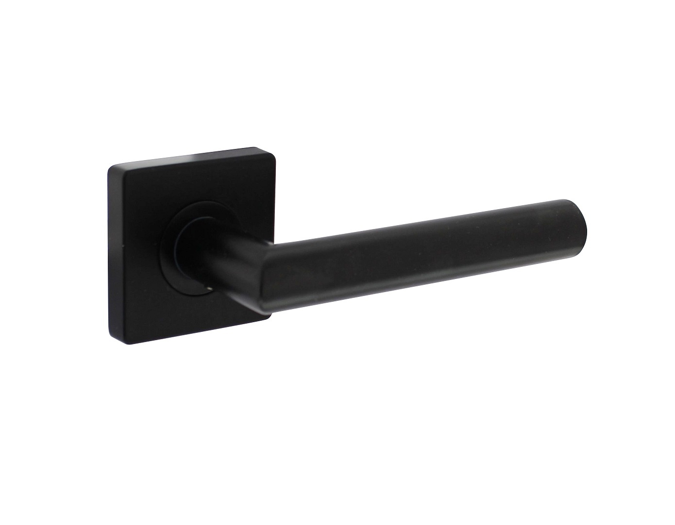Der Bastian Türgriff auf einer quadratischen Rosette ist in der trendigen Farbe Mattschwarz erhältlich. Die quadratischen Rosetten sind mit Ösen versehen, damit sie besser an Ort und Stelle gehalten werden.