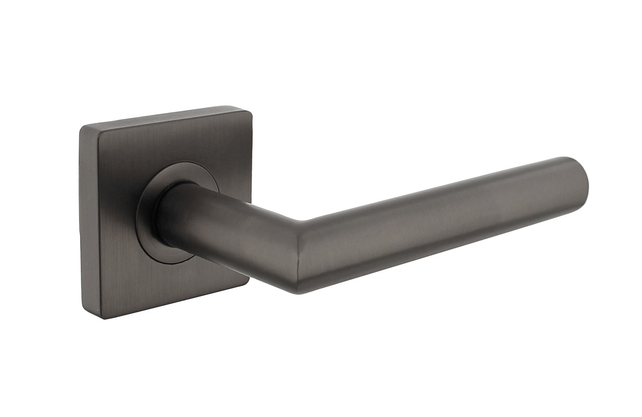 Der beliebte Bastian-Türgriff mit quadratischer Rosette besteht aus Zamak und ist mit einer anthrazitgrauen Beschichtung versehen, der aktuellen Trendfarbe.