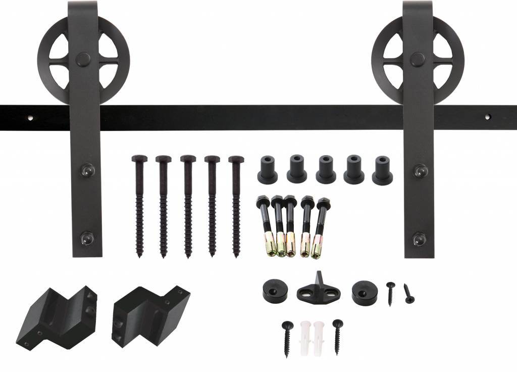 Es handelt sich um ein modernes Schiebetürsystem mit großen Speichenrädern, das aus zwei 100 cm langen Stahlschienen besteht.