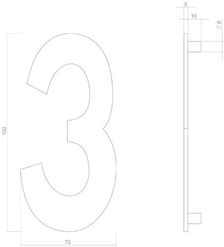 Diese schwarze Hausnummer "3" von Intersteel hat eine Höhe von 150mm und eine Dicke von 3mm. Im montierten Zustand ragt es 10 mm aus der Wand heraus.