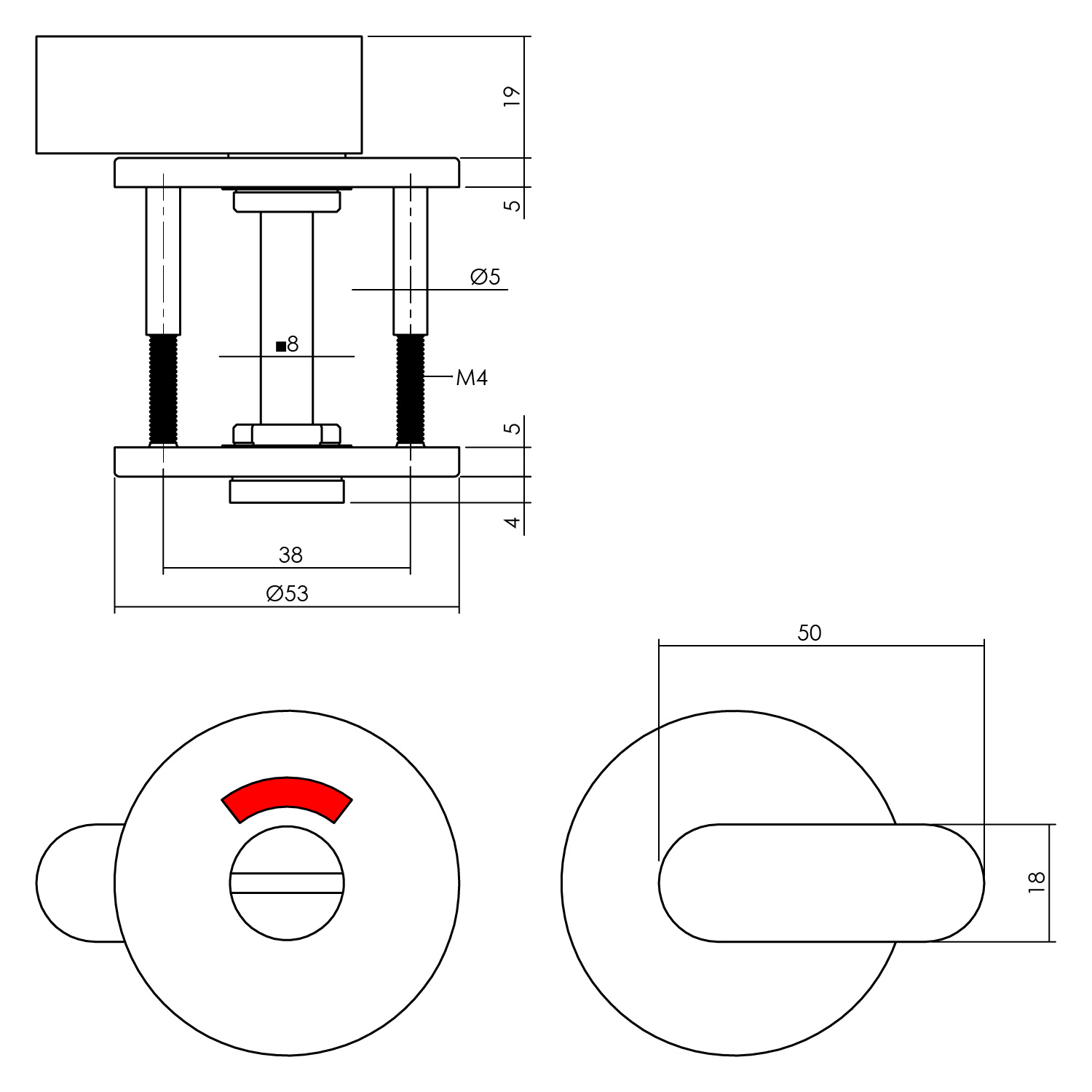 Dieser runde Toiletten- / Badezimmerverschluss hat ein rot / grünes Fenster und eine quadratische Spindel von 8 x 8 mm. Dieser Verschluss wird paarweise inklusive Montagematerial geliefert.