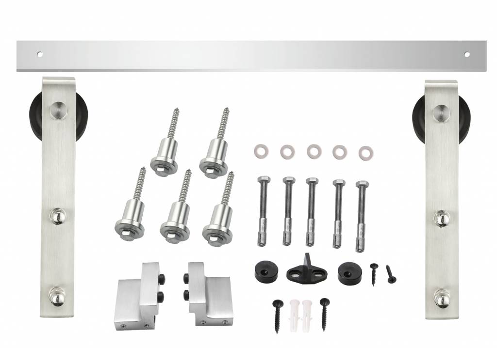 Um eine einwandfreie Führung der Schiebetür zu gewährleisten, werden Edelstahl-Türstopper, Distanzstücke und eine Bodenführung mitgeliefert. Dieses Set wird inklusive Montagematerial angeboten.