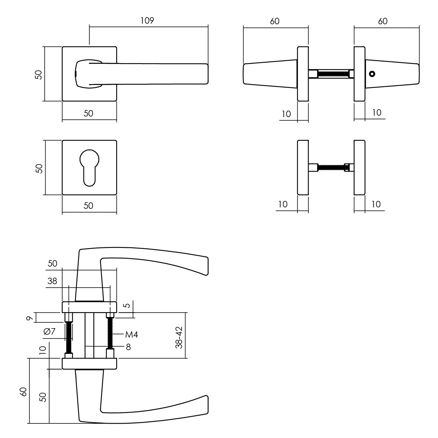 Der Türgriff steht auf einer quadratischen Rosette von 50 x 50 mm, die 10 mm verlängert ist. Diese Rosette ist mit Nocken ausgestattet, die sie besser an Ort und Stelle halten.