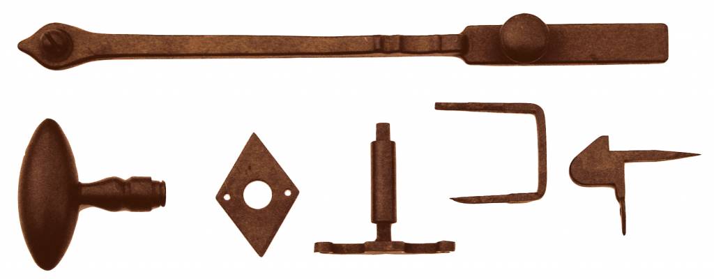 Dieses rostfarbene Set ist komplett für eine Tür, mit einem ovalen Türgriff auf der einen Seite und einer Stange auf der anderen Seite, die sich beim Drehen des Griffs auf und ab bewegt. Diese Stange fällt dann hinter einen Haken (Nase).