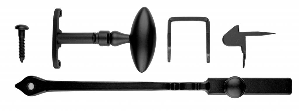Dieses Komplettset ist für eine Tür mit einem ovalen Türgriff auf der einen Seite und einer Stange auf der anderen Seite, die sich beim Drehen des Griffs auf und ab bewegt. Diese Stange fällt dann hinter einen Haken (Nase).