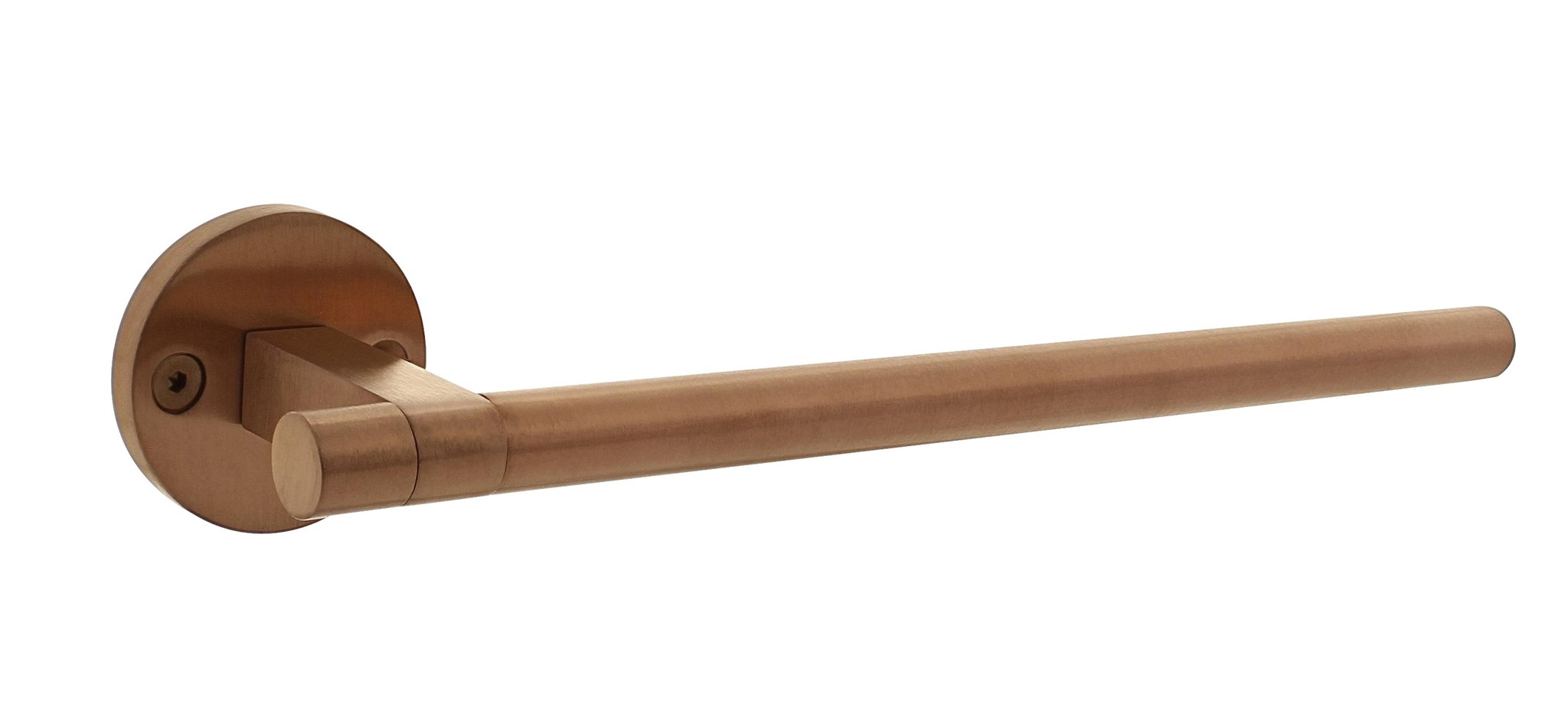 Der Türgriff ist aus Edelstahl gefertigt und anschließend mit einer sehr starken matten Kupfer-PVD-Beschichtung versehen. Auch dieser Türgriff ist auf der linken Seite einseitig verdeckt, wodurch nur die Seite, auf der der Griff nach links zeigt, blind gelagert ist. Die Schraubenlöcher sind auf der anderen Seite sichtbar.